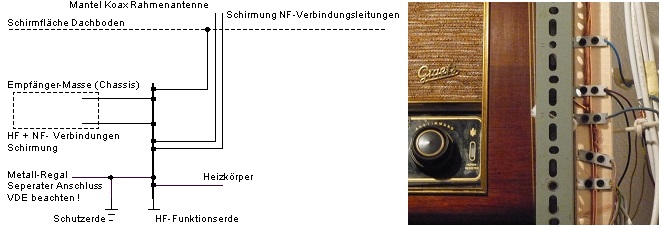 Abschirm-Maßnahmen und Erdung Alles, was aus Metall besteht, ist hier geerdet. Unter der Rahmenantenne ist darüber hinaus eine abschirmende Fläche aus Maschendraht installiert. 2 Empfänger-Standorte habe ich hier, und da laufen die einzelnen Leitungen sternförmig zusammen und sind dort zusammengeschaltet: