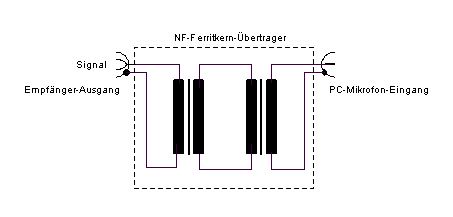 PC-Signaltrennung Als Problem erwiesen sich Tonaufnahmen mit dem PC, die Anschaltung der PC-Abschirmung auf die Empfänger- Masse brachte Störungen rein. Es wurde daher getrennt, da kein 1:1-Ferritkern-NF-Übertrager zur Verfügung stand, wurden 2 zusammengeschaltet: Oft bringen die einfachsten Schaltungen beste Ergebnisse.