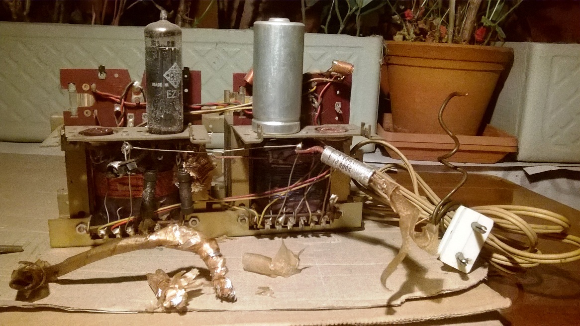 Sehe ich genau so. Normalerweise hat dort einer Schluss und dann fliegt die Sicherung wegen maximalem Anodenstrom. Eine überlastete heizwicklung kann ich mir ohne Isolationsmangel in einer der Zuleitungen gar nicht erklären. Aber vielleicht ist ja die EZ81 durchgeschlagen...dann würde vom Trafo mit der Heizwicklung Strom zu einer Wicklung der Anadenspannung im 2. Trafo fließem.