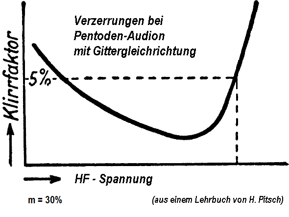 Wenn der Demodulator sowohl mit niedrigen als auch mit hohen Pegeln ein Problem hat (Gitter-Audion), dann steigen die Verzerrungen mit dem Modulationsgrad zwangsläufig an, und der Spannungsbereich, der eine brauchbare Demodulation liefert, wird kleiner. Im Diagramm von Wolfgang kann man das so interpretieren, dass bei höherem Modulationsgrad der linke Schnittpunkt der Kurve mit dem 5%-Wert nach rechts rückt, während der rechte Schnittpunkt nach links rückt, somit wird der Spannungsbereich bei vorgegebenem Klirrfaktor kleiner.