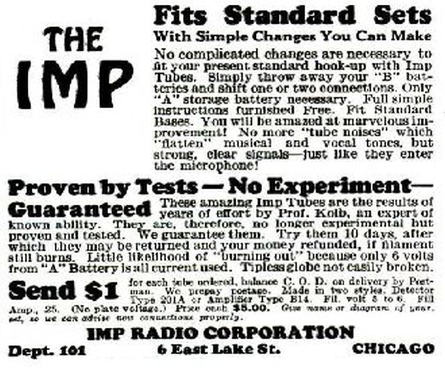 Nun will ich nicht so schnell ein Urteil abgeben, wovon ich nur wenig Einsicht habe, was sich damals in den USA so abspielte. Aus diesem Grund habe ich in einem bekannten USA Radio-Forum diese Frage aufgeworfen: Kam untenstehende Röhre wirklich in den Handel? Oder war das nur eine "vielversprechende" Werbung? Bisher konnte keiner die Existens der "IMP" bestätigen.....