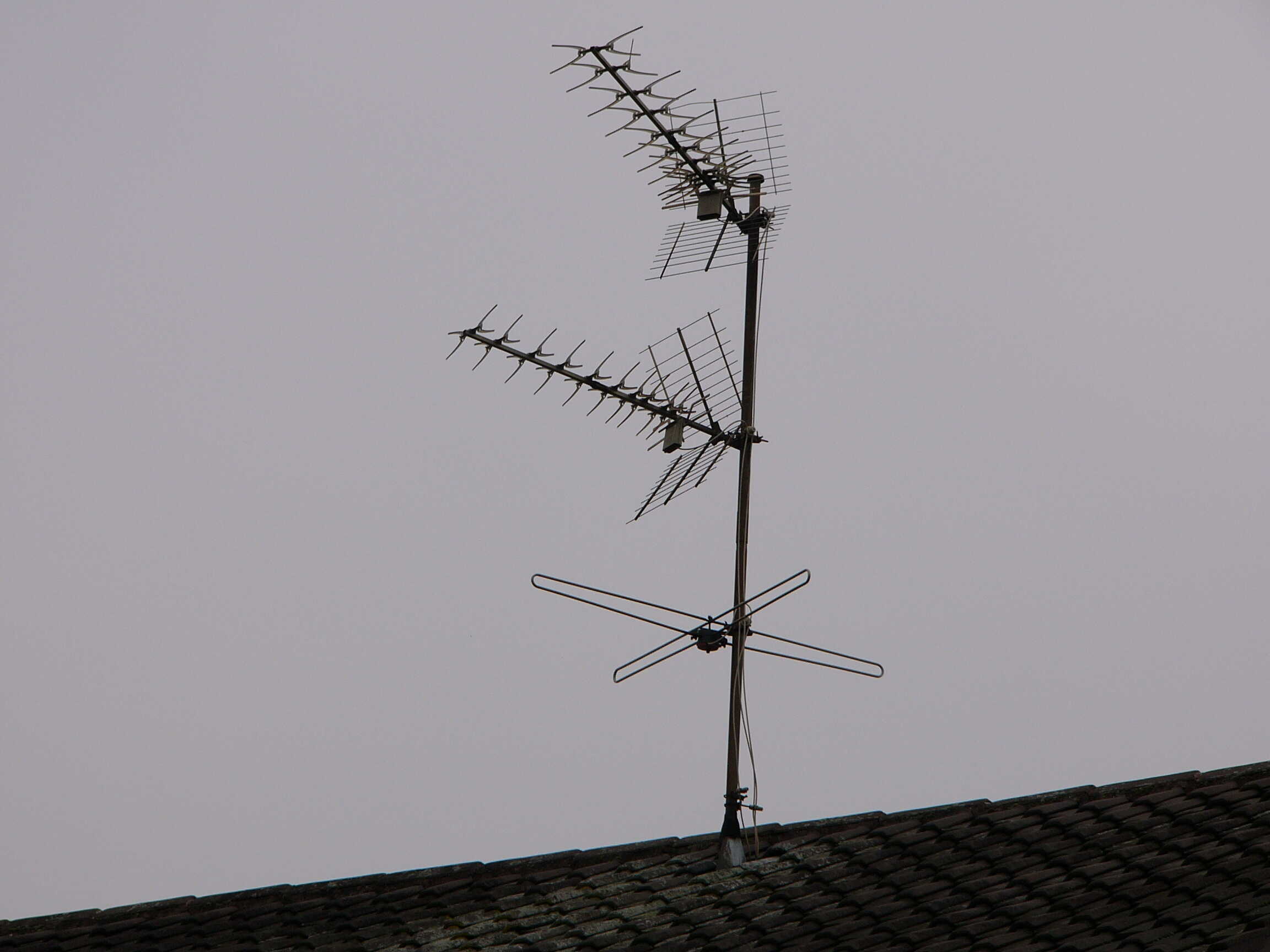 Dazu müssten die natürlich identifiziert werden. Oben Kathrein ARA 30. LMK-Rute (mit Prasselschutz) und unten eine 3-Element-UKW-Yagi. Der Dipol ist verbogen.