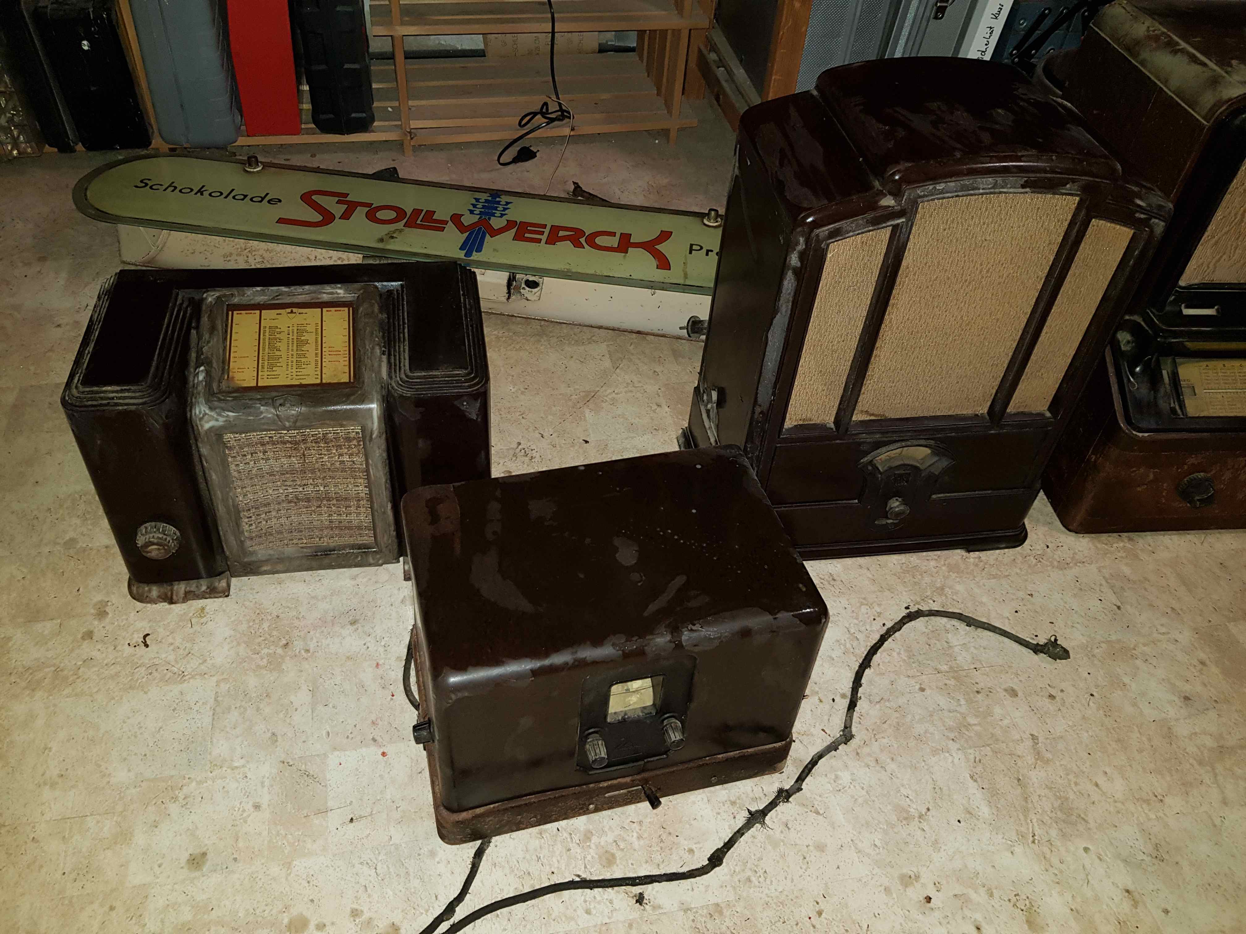 Kurz vor Silvester hat mich ein Verwander informiert, das mein Schwiegervater vor rund 60 Jahren bei ihm in der Scheune ganz oben und ganz hinten Radiogeräte deponiert hat. Er schmeißt sie jetzt raus. Also habe ich sie gesichtet. 60 - 70 Geräte in allen Zustandsarten. Funktinstüchtig ist keines mehr. Habe ca. 25 Geräte gesichert - meistens Volksempfänger. Aber auch ein paar optisch schöne. Urteilt selber. Evtl. könnt ihr mir auch was zu den Geräten sagen - der auf dem Stapel der Volksempfänger oben rechts z.B. Bei den anderen Geräten habe ich nur den Lumophon "markgraf" und den Schaub "bali" gefunden. Auf dem Dachboden liegt auch noch ein Tefag. Den sichern?