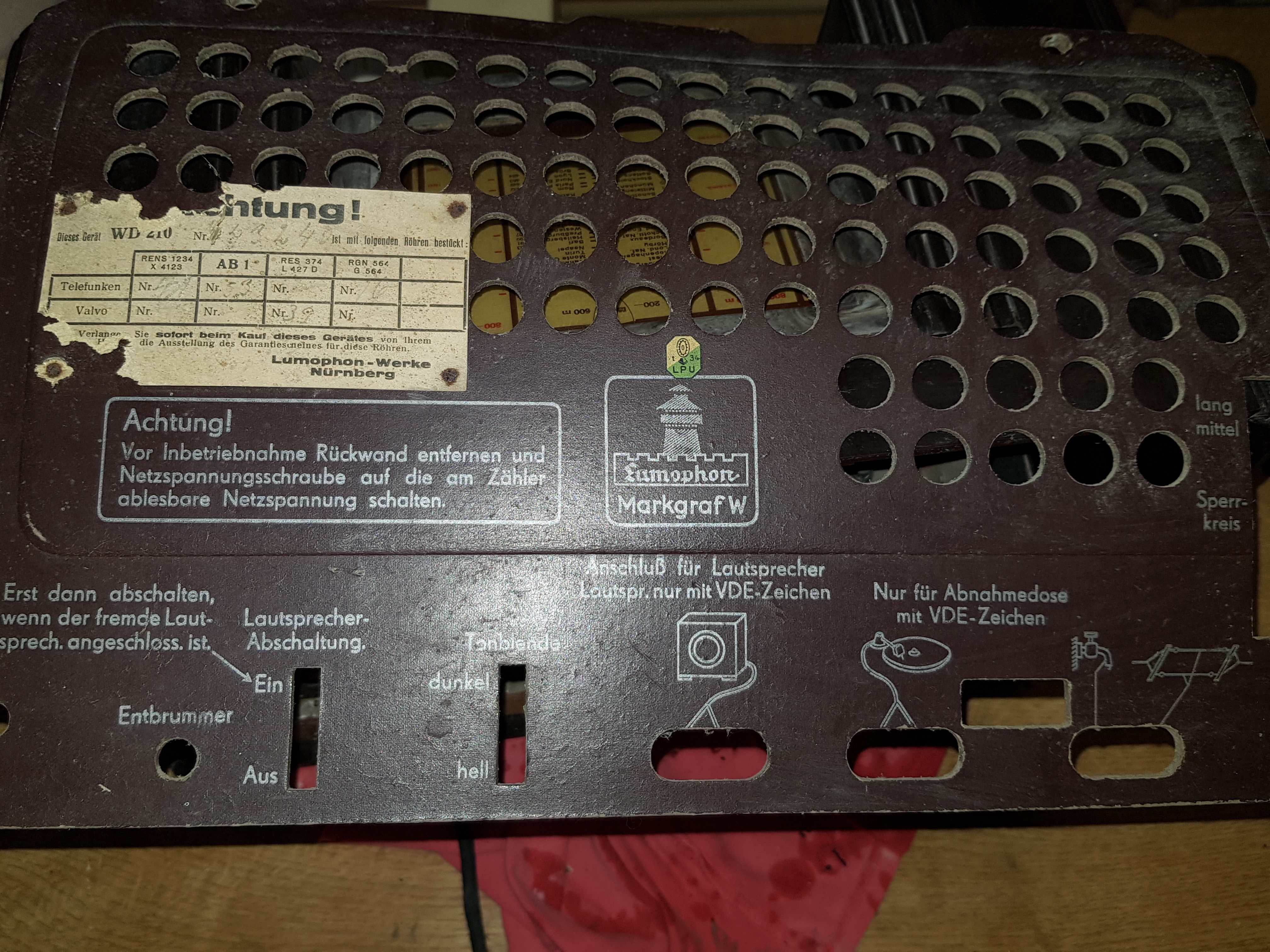 Hallo! Nochmals recherchiert- der Radio ist ein Körting (Logo war hinter dem Bohrmehl der Holzwürmer). Wahscheinlich ein S3320 WL. Und Radiofunk war eine Firma in Ludwigsburg ; Wolf G. Medow.