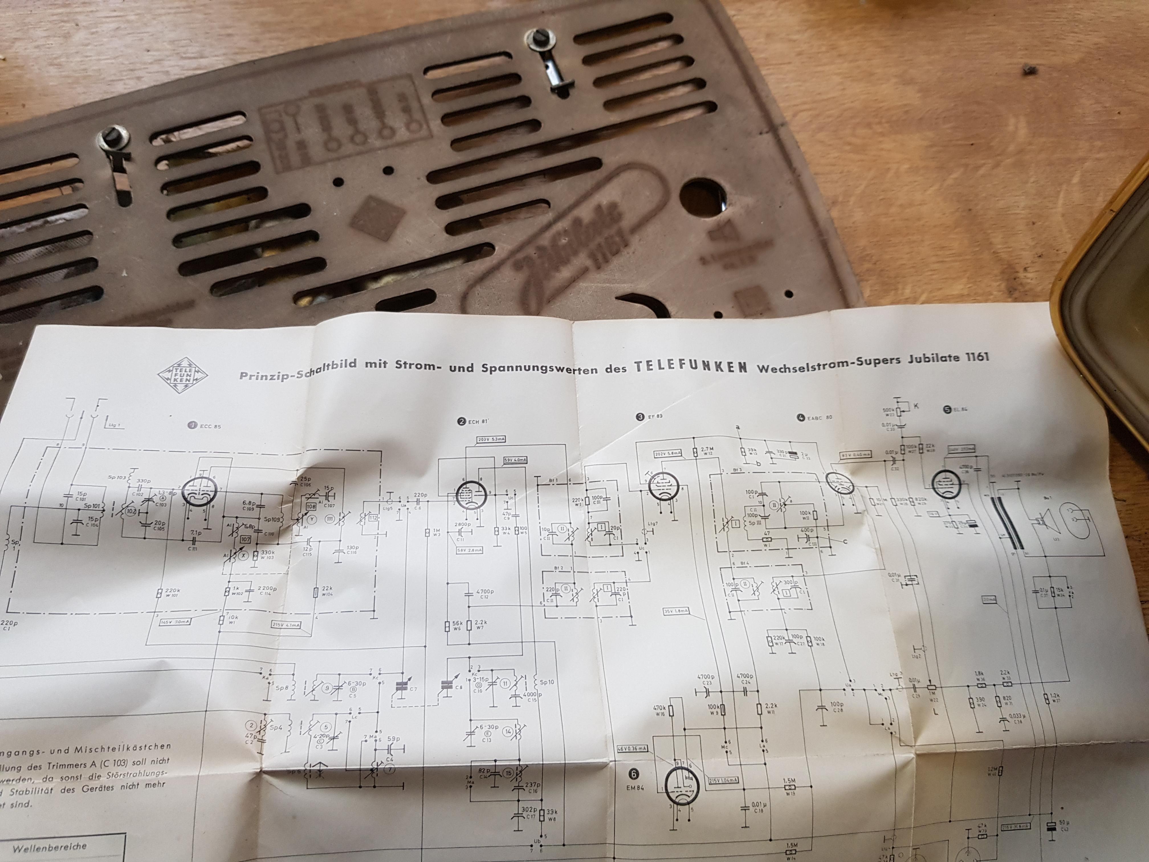 Hallo! Habe mich vorhin getraut einen Telefunken Jubilate zu reinigen und ihn einfach mal ans Stromnetz zu hängen. Auf UKWkonnte ich immerhin Bayern1 und B4 Klassik empfangen - wenn auch ganz leise. Und der Schaltplan war auch noch im Gehäuse. Habe mich gefreut. Schönen Sonntag noch. Grüße Jürgen