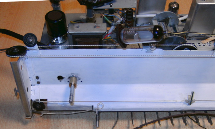 Wer genau das Chassis Foto betrachtet, wird einen weißen Gewebeschlauch sehen der vom Netztrafo wegführt. In diesem Schlauch ist die Leitung zum Netzschalter. Ursprünglich war ein einfacher dünn isolierter Draht über das Chassis gelegt worden der zum Netzschalter ging. Bei einer fehlerhaften Isolation des fast 60 Jahre alten Gerätes würden 230 V am Chassis sein. Wer so ein Radio hat bitte die Leitung schützen oder eine neue sichere 230 V Leitung legen.