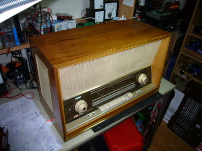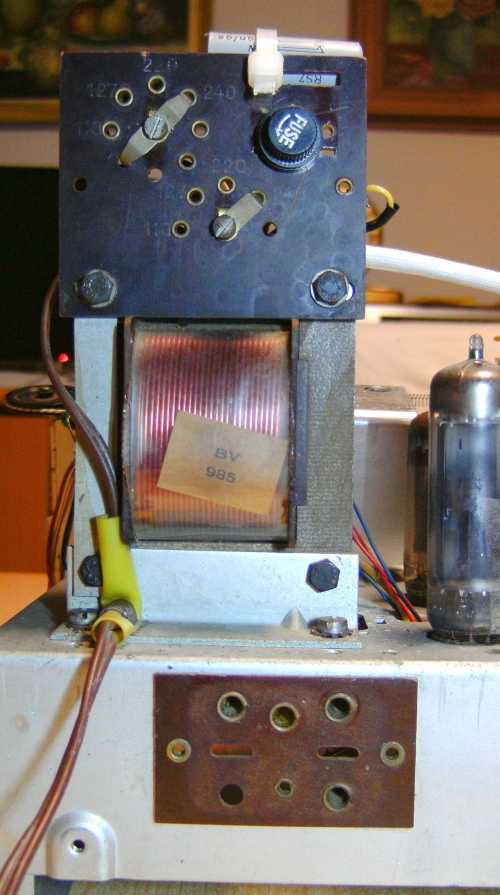 Nun noch ein paar Fotos. Die Schallwand neu mit Vintage Stoff, die alte war selbst für Spar - Eumel nicht mehr zu gebrauchen. Neuer Sicherungshalter, der alte war auch nix mehr. Die neue EABC 80 Eine 6T8A. Für den Y Kondensator brauch ich noch eine passendere Halterung.