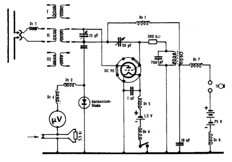 Die Anodenspannung gelangt nur an die Röhre, wenn ein Kopfhörer angeschlossen wird. In diesem Fall wird das Messinstrument in Serie zu einem 3,5 kOhm Widerstand geschaltet. Wird einer der Frequenzbereiche ausgewählt, wird die Röhre geheizt.