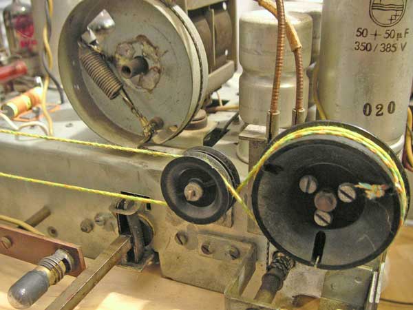Jetzt wird die Spannung gelockert (nicht ganz loslassen) und dann zieht man mit Daumennagel und Zeigefinger mehrmals über das ganze Band, bis das Verdrillen gleichmäßig über das gesamte Band erfolgt. Die Kordel ist fertig. Das Skalenseil besteht nun aus 4 Fäden Zwirn und sollte ihren Zweck als Skalenseil gut und lange erfüllen können. Hier als Beispiel meine Philips BD390A.