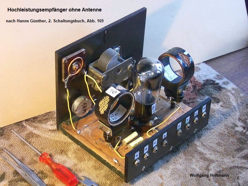 Das heißt also, der Aufbau selber ist eine Art Hilfsantenne. Sowas geht sicherlich in Sendernähe, ist aber wenig professionell. So kenne ich Hanns Günther nicht! Schon aus didaktischen Gründen gehört an jeden Empfänger eine Einspeisung der HF an zwei Punkten, Antenne und Erde, wie allgemein bekannt.
