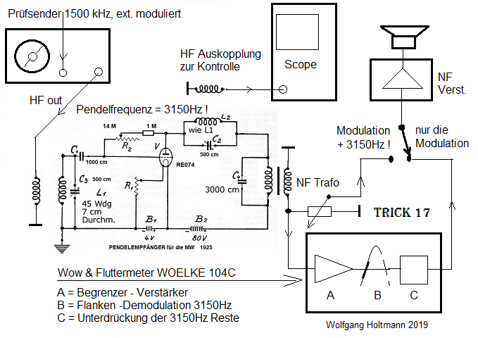 Der Trick 17 ist nun, die Pendelschwingungen genau auf 3150 Hz abzustimmen, was einer Wiederholfrequenz von 317 µs entspricht. Dann zeigt der Driftmeter des Wow & Fluttermeters Mittelstellung an, ist aber zu träge, um der Modulation zu folgen. Ich habe jedoch eine Modifikation angebracht, die nach der Flankengleichrichtung und Filterung mir die gewonnene Spannung nach außen führt. Ein NF-Verstärker mit Lautsprecher bringt dann die Darbietungen zu Gerhör, jetzt aber ohne den verdammten Pfeifton....