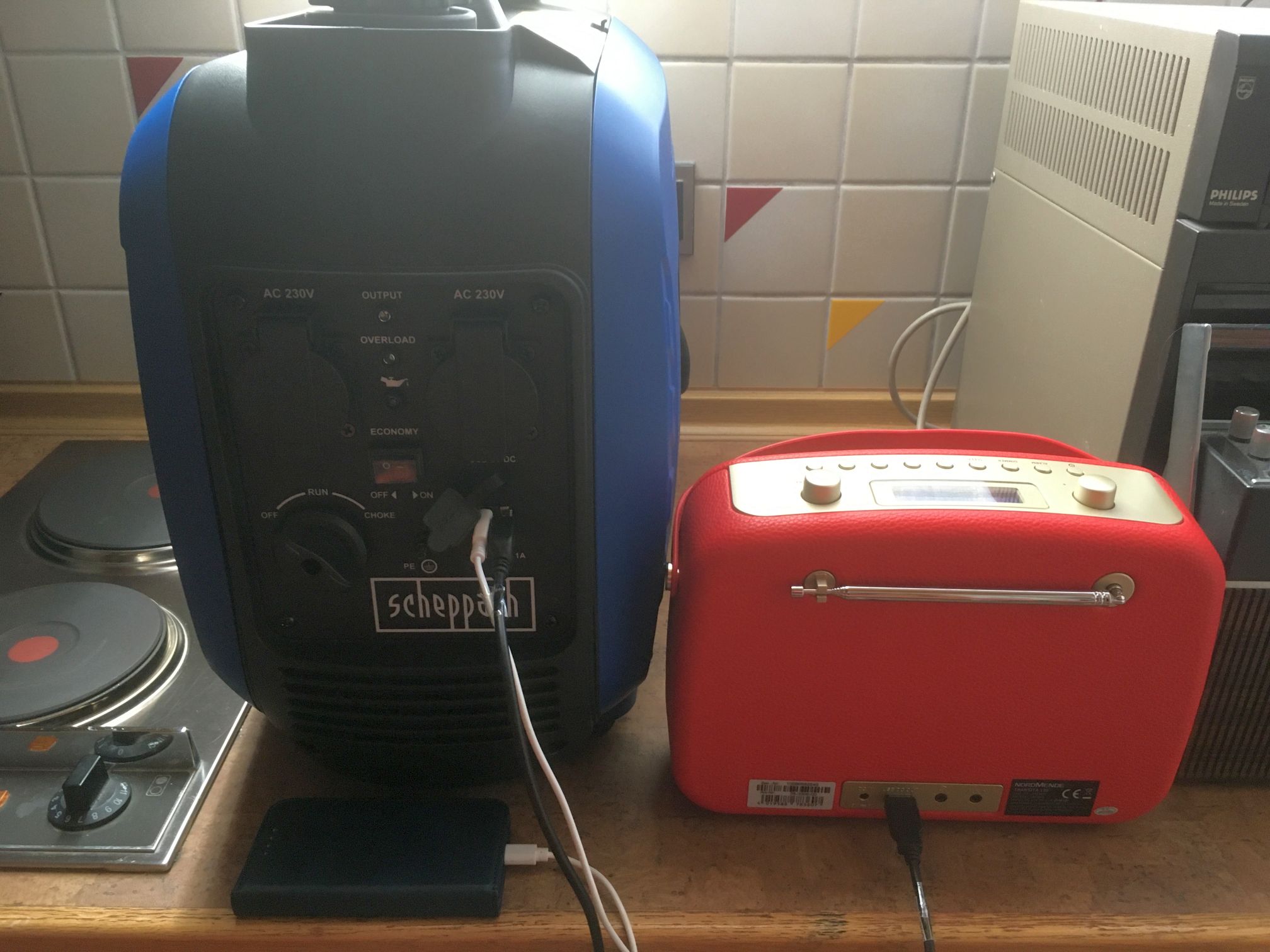 Das Notstromaggregat Scheppach SG2500i auf Inverterbasis hat übrigens neben 2x230V AC auch zwei 5V-USB-Buchsen. Ob man immer die passenden Kabel findet, ist eine andere Sache. Der Abgasschlauch lässt sich aus dem Fenster leiten. Besser für die Nerven ist der Betrieb in der geöffneten Garage über ein längeres Kabel oder im Keller mit Zugang zur zweiten Kaminröhre und zum Hausanschlusskasten.