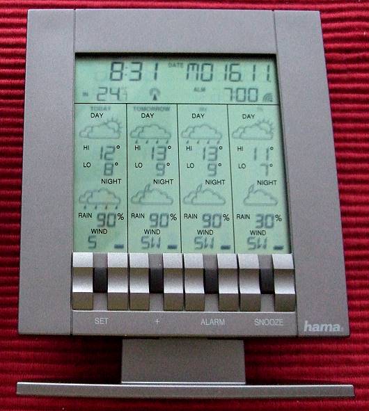 Zu 2: Der Zeitzeichensender DCF strahlt, täglich einmal aktualisiert, folgende Daten für 4 Tage aus: Tag und Nacht mit Sonne - Bewölkung - Regen - Schnee. Tageshöchsttemperatur, Tagestiefsttemperatur, Regenwahrscheinlichkeit in %, Windsrichtung, Windstärke. Europa wird in 60 Vier-Tage-Vorhersage-Zonen und in 96 Zweitage-Vorhersage-Zonen unterteilt. Man gibt anhand einer Tabelle dem Gerät die Zone an, die es zukünftig anzeigen soll, das System kann also auf Ortswechsel reagieren. Es gibt zwischenzeitliche viele solcher Anzeige-Stationen für das Wohnzimmer. Zusätzlich wird die DCF-Zeit und das Datum angezeigt und die aktuelle Zimmertemperatur. Als Beispiel für ein solches Gerät sei das Wettervorhersagecenter WFC-500 von Hama genannt.