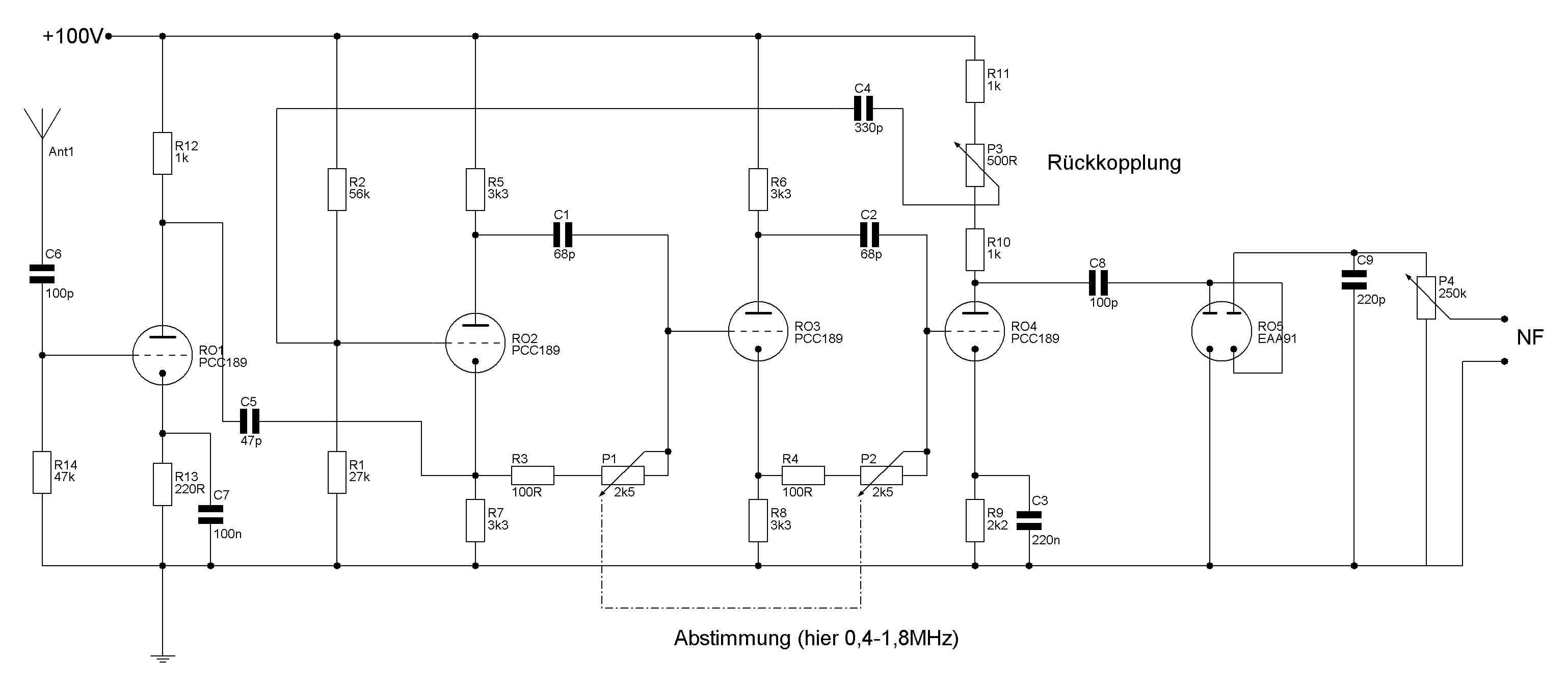 Jetzt spinne ich mal rum: normale Mischstufe mit ECH81 und danach eine spulenlose ZF nach diesem Muster.