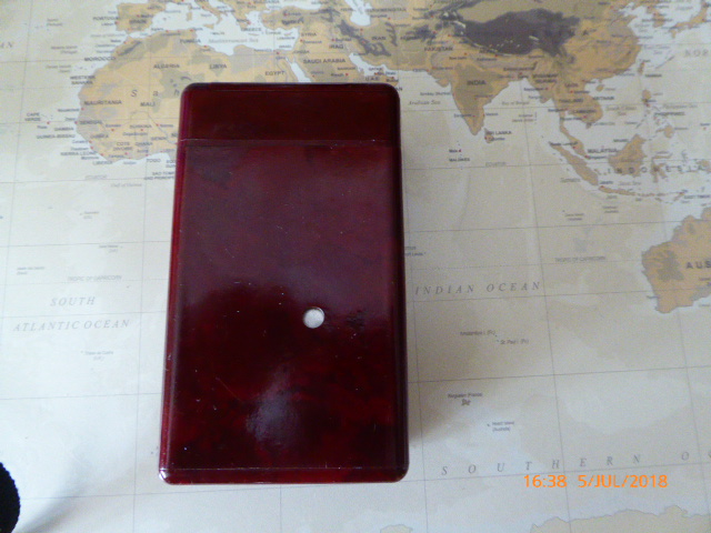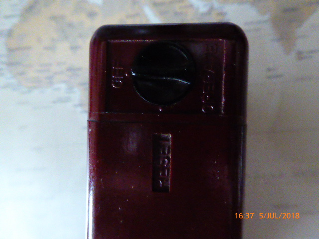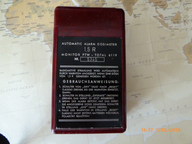 This instrument is a dosimeter that gauges the dangerous kinds of radiation: beta, gamma, röntgen radiation and fast neutrons. It signals with a beeper when 0,5 Röntgen of received radioactive radiation (of all kinds) has been exceeded. The beeper can be reset with a switch on the side of the dosimeter. Because 0.5 Röntgen is a relatively low and a not really dangerous amount of radioactive radiation for humans this alarm dosimeter will excellently serve as a personal early warning system for radioactive radiation. The housing has been made of red/brown bakelite; inside are a Geiger-Müller tube, a lot of electronic components and a beeper. It is 12 centimeters (almost 5 inches) high so it is small enough to fit in your pocket. It has been manufactured by Total between 1960 and 1975 most likely in the USA. On the aluminum sheet sticker has been printed a.o.: AUTOMATIC ALARM DOSIMETER 0,5 R. - MONITOR PTW - TOTAL 6119 NO. 7052