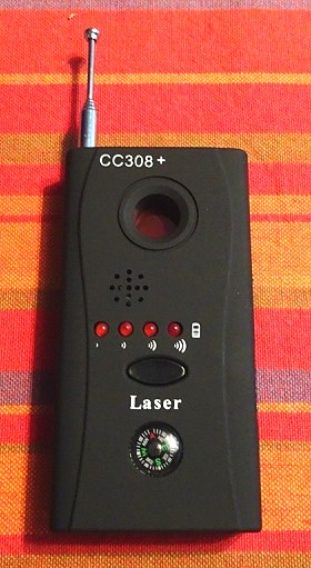 Hier ist so ein Wanzenfinder (Modell CC308+ von Pulox) zu sehen. Der hat einen Verstärker, eine ausziehbare Antenne, eine akustische und LED-Anzeige und behauptet auch Spionage-Mini-Video-Wanzen an ihren Objektiven optisch erkennen zu können, was auch in gewissen Grenzen funktioniert.