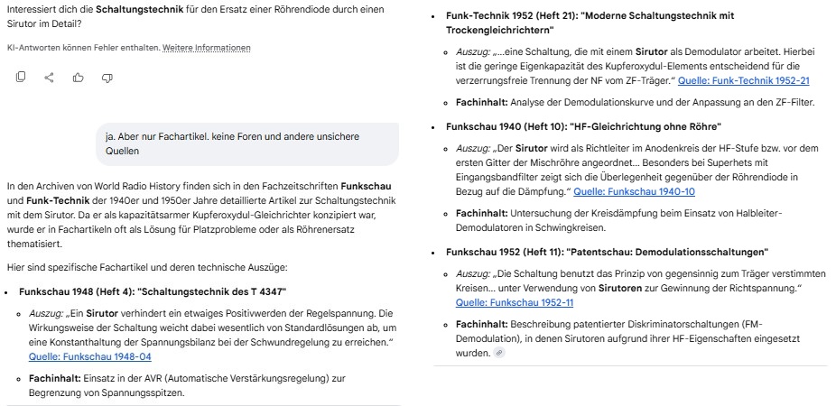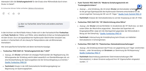 Es wurde auch ein Beitrag in diesem Forum ausgegeben, und hier stimmte aber die Angabe "Funkschau 1943 Heft 8-9", Der Artikel lautet: "Anregungen zum Detektorempfang". Bei einem Tippfehler etc. hätte die KI-Suche vermutlich ein falsches Ergebnis geliefert.