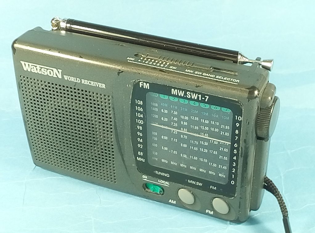 das ist mein altes Transistorradio Watson TR4029. Es kann UKW, Mittelwelle und viele Rundfunk-Kurzwellenbänder. Das Radio passt auf die flache Hand und kommt mit 2 AA-Batterien aus: