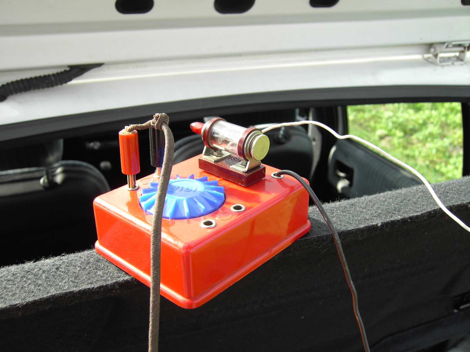 Im Kofferraum steckte ich den Kopfhörer, 2 x 2000 Ohm, mit Erd- und Antennendraht in den Detektor und begann mit der Spitze der Nadel den Kristall abzusuchen. Ja, Bananenstecker sind Mangelware.