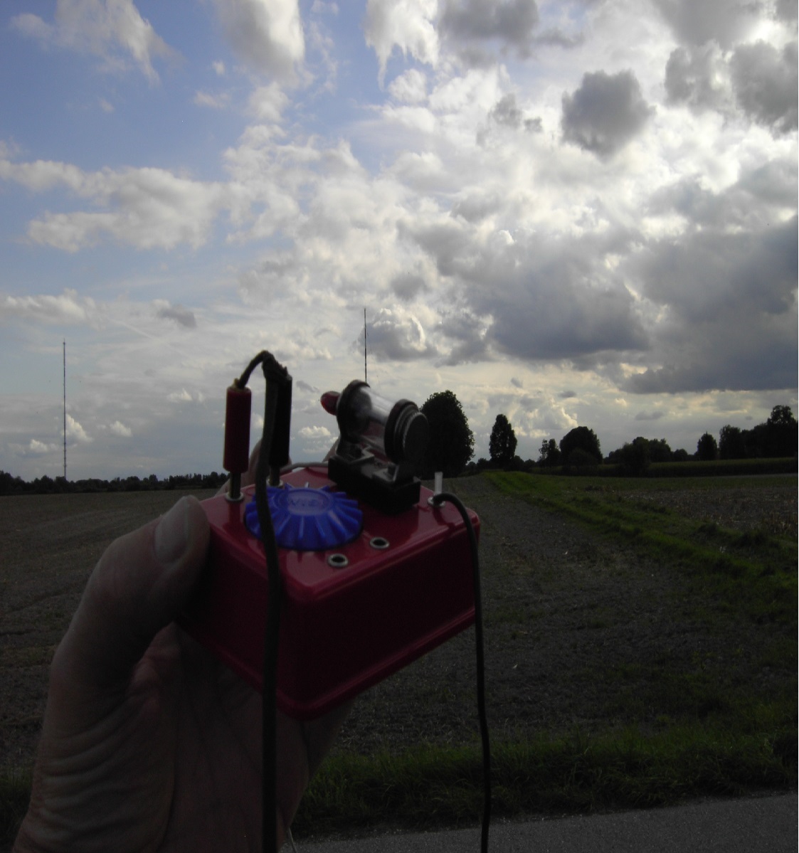 Auf der Heimfahrt machte ich noch einen Versuch außer Sichtweite des Senders (5 Km) mit gutem Ergebnis, bei Freising (15 Km) dann jedoch ohne Ergebnis, da der Boden für die Erdung völlig ungeeignet war. Außerdem befindet sich dort der Flughafen München in gerader Linie zum Sender und macht vermutlich alle Wellen nieder.