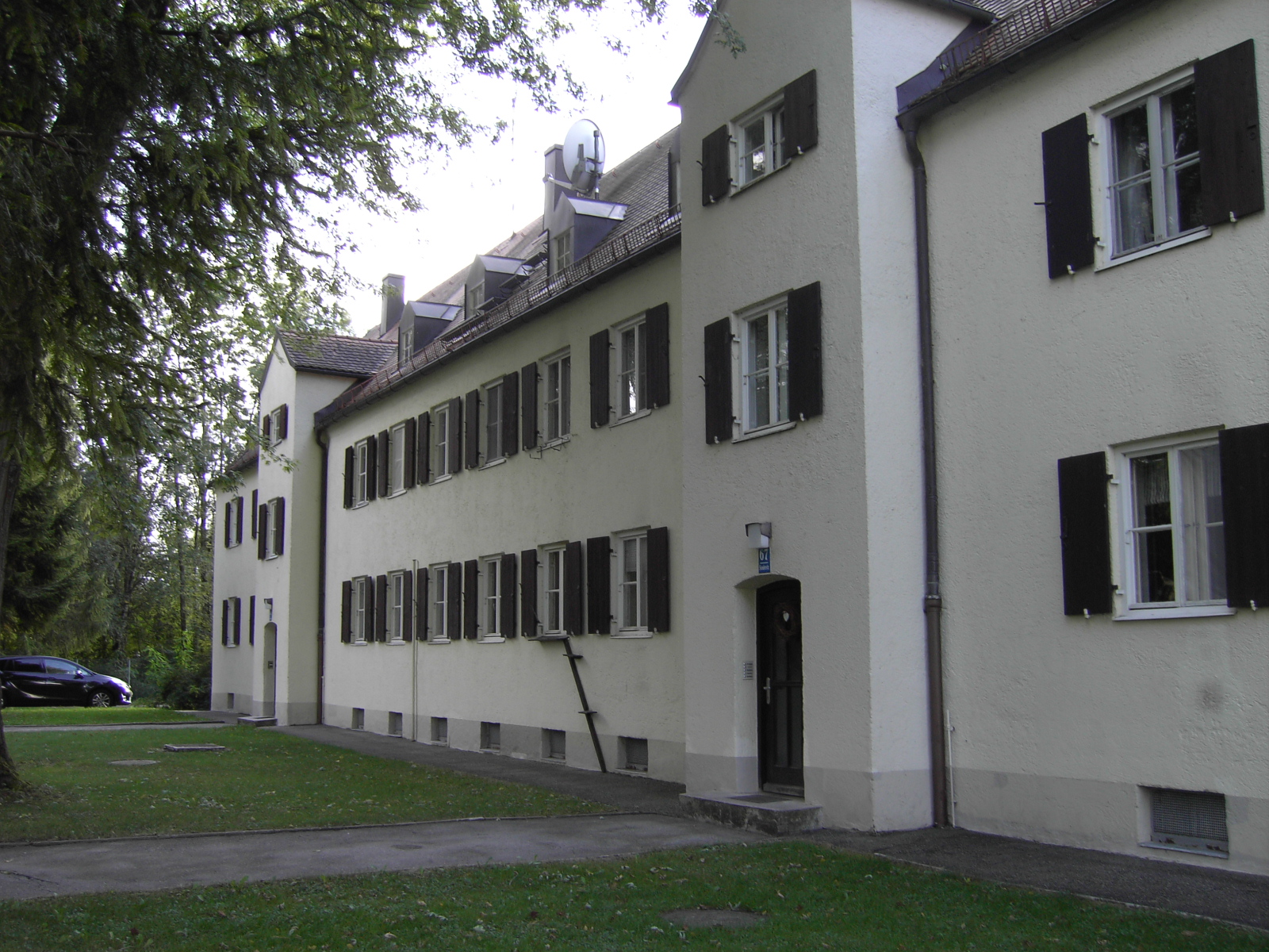 Im Außenbereich, direkt am Haupteingang, steht dieser, trotz Katzentreppe, SAT Schüssel und Vorhängen, verlassene Wohnblock aus frühen Tagen. Ich vermute Mitarbeiterwohnungen.
