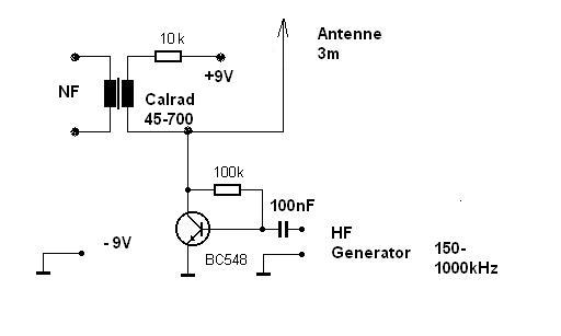 der erste Versuch hat schon geklappt. Man kann mit meinem Frequenzgenerator (bis 1MHz) auf LW/MW ein Trägersignal senden. 3m Draht direkt ohne Masse an die BNC- Kupplung gesteckt... und sendet bis zu 10m.