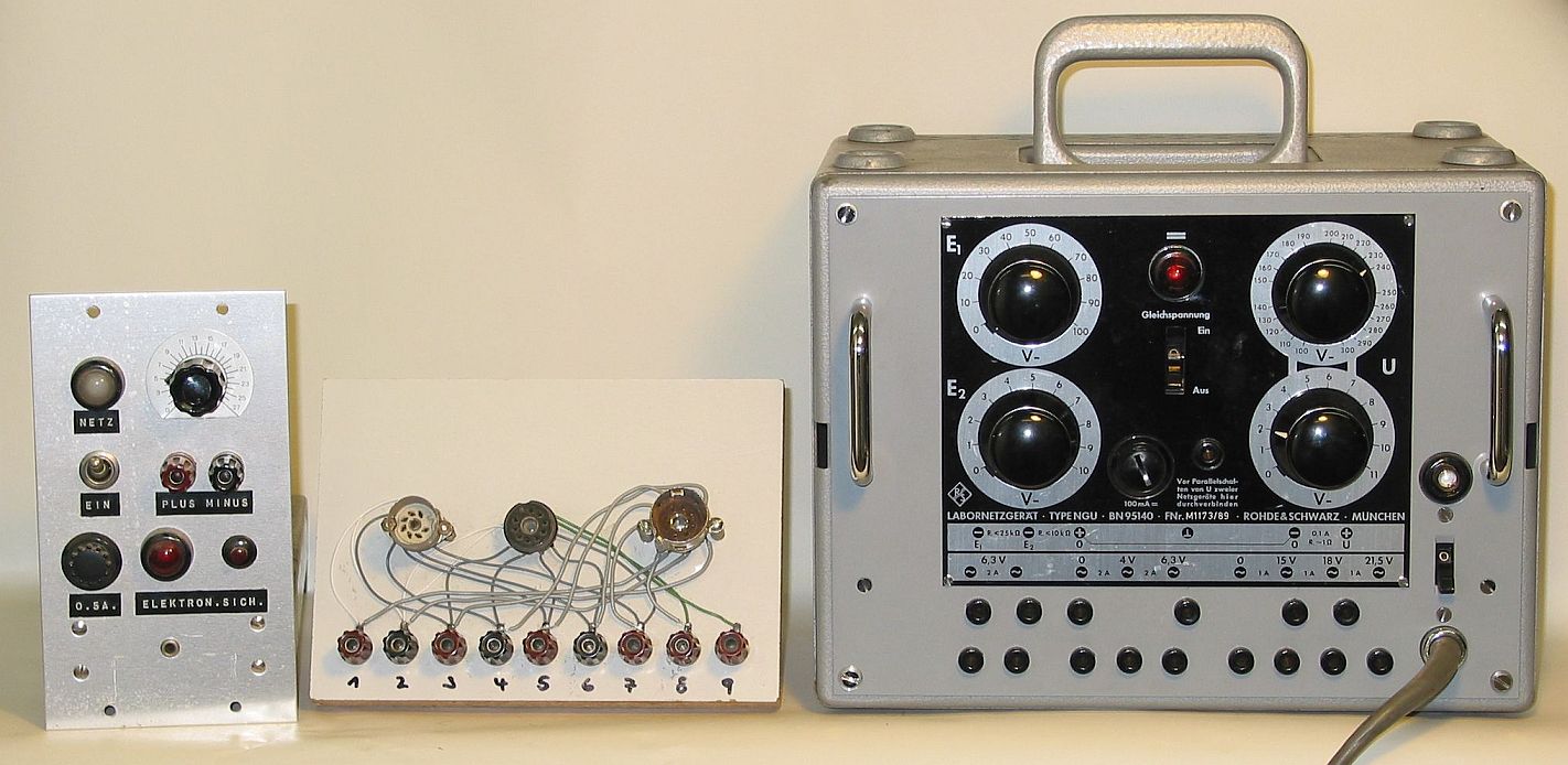 Es enthält nur je eine 7/9-polige Noval- und eine Rimlock-Fassung. Bei Bedarf kann ich aber in kürzester Zeit einen passenden Adapter zurechtlöten. Betriebsspannungen liefern diverse externe Netzteile (R&S-NGU etc.).