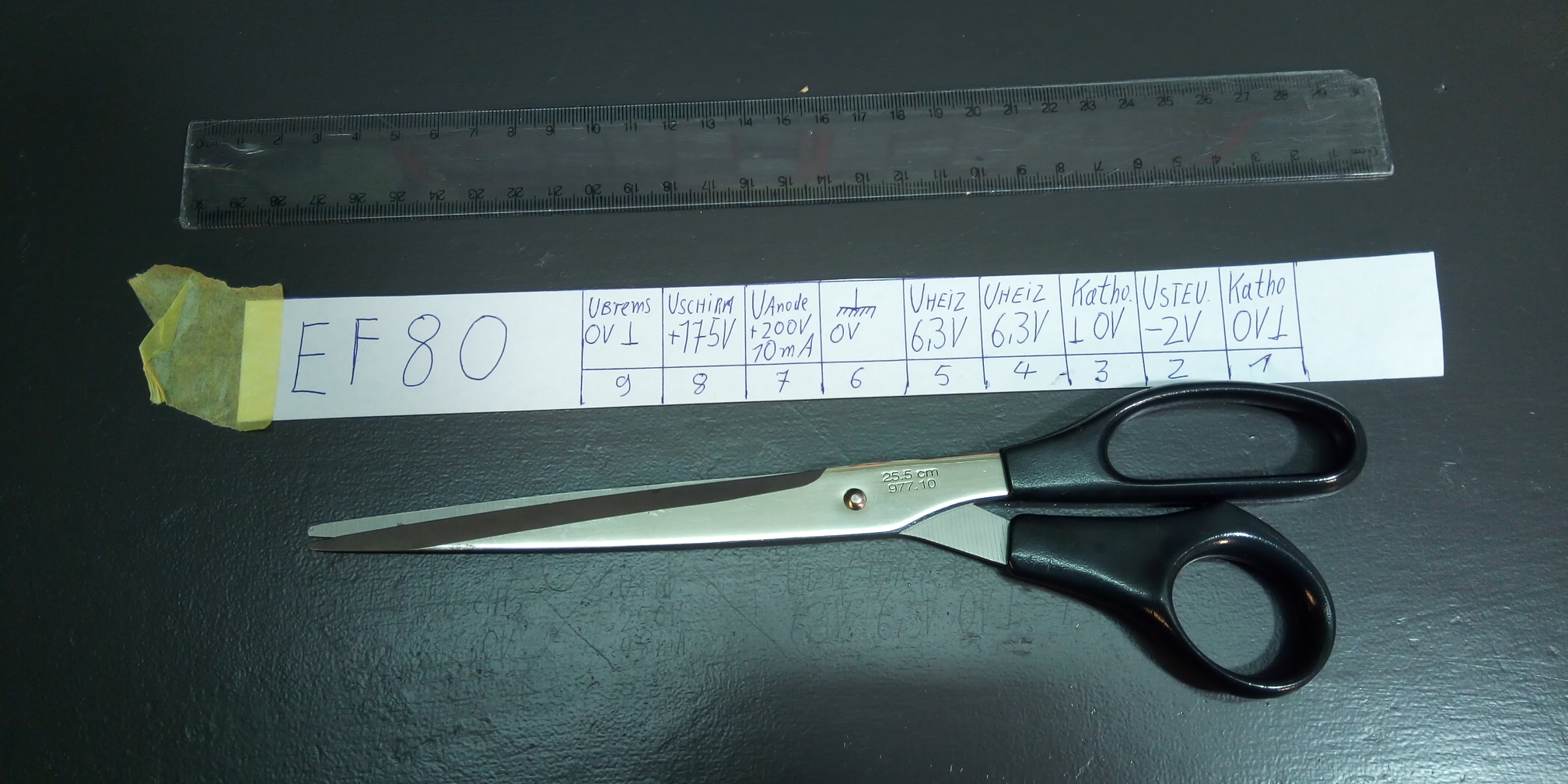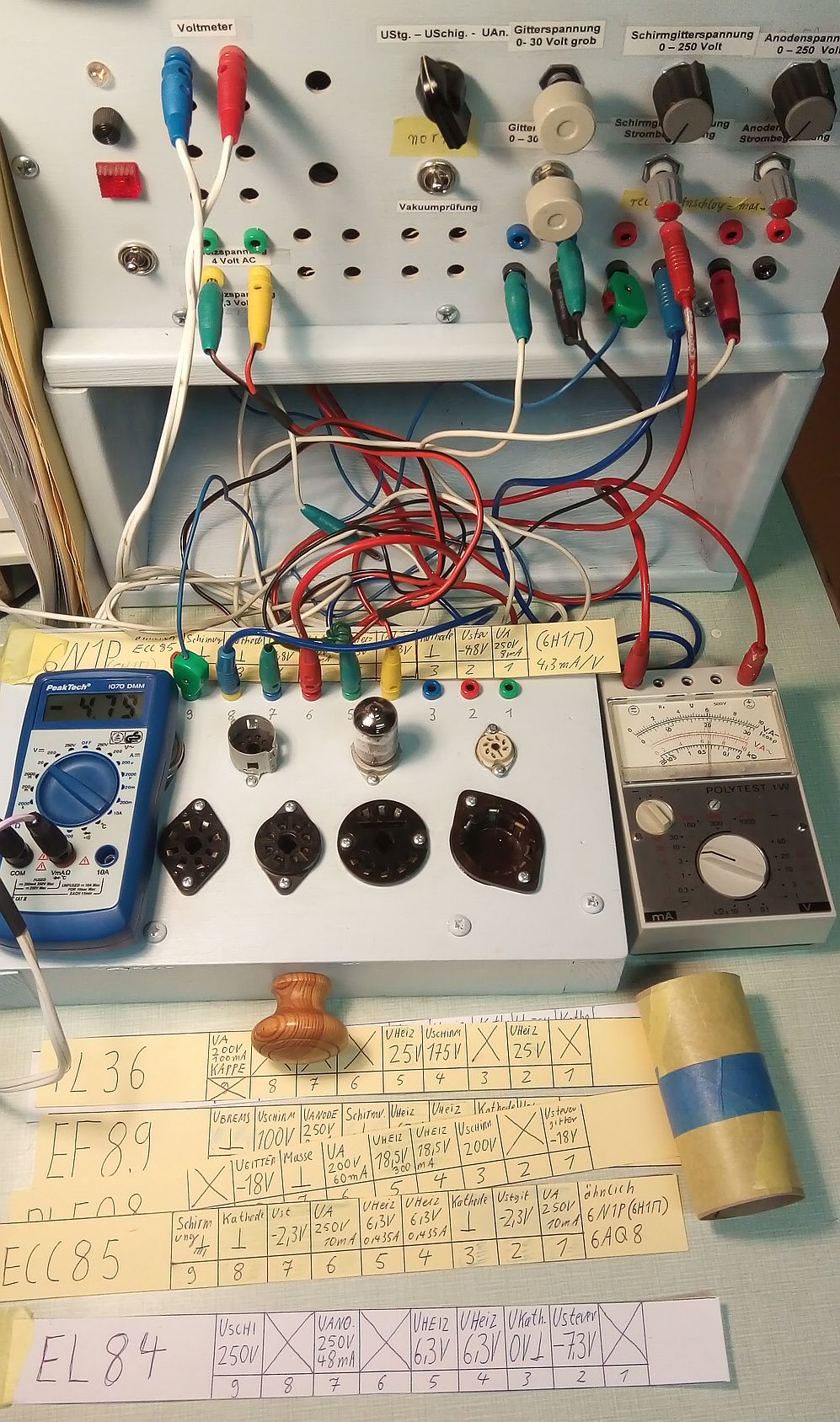 Um die Prüfung zu vereinfachen, habe ich Papierstreifen mit den Röhrendaten eingeführt. Man legt sie einfach hin, was das Stöpseln vereinfacht. Ergonomisch leider nicht perfekt, aber es geht in die richtige Richtung: