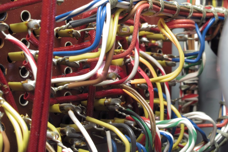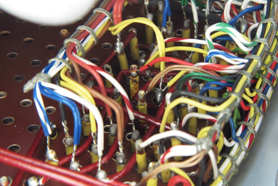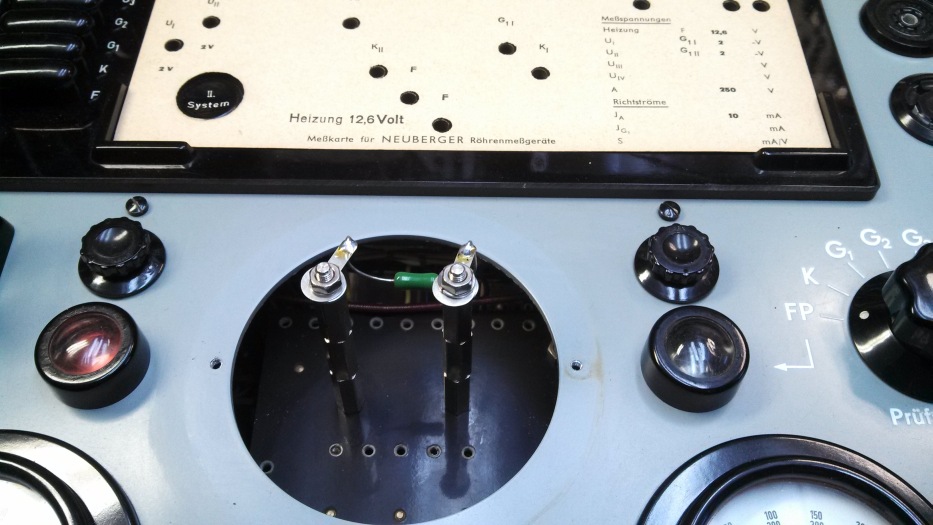 Genauer: Es war unabhängig ob eine zu prüfende Röhre gesteckt war links oder rechts. Eine Testkarte und Kreuzstecker mussten aber gesteckt sein. Hier auch der Anodenstecker. Ohne Stecker kein zuckender Zeigerausschlag. An der auf den Werktisch stehenden Frontplatte mit der Verdrahtung war bei zuckendem Zeiger nichts zu hören oder zu sehen.