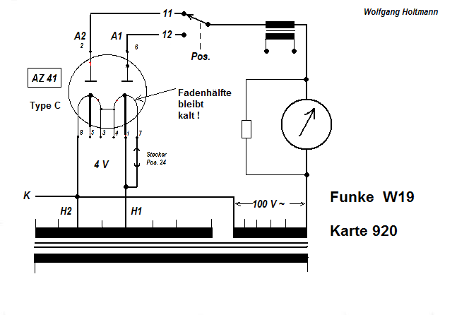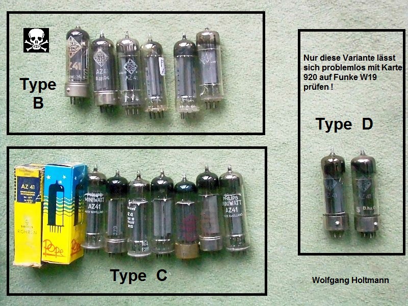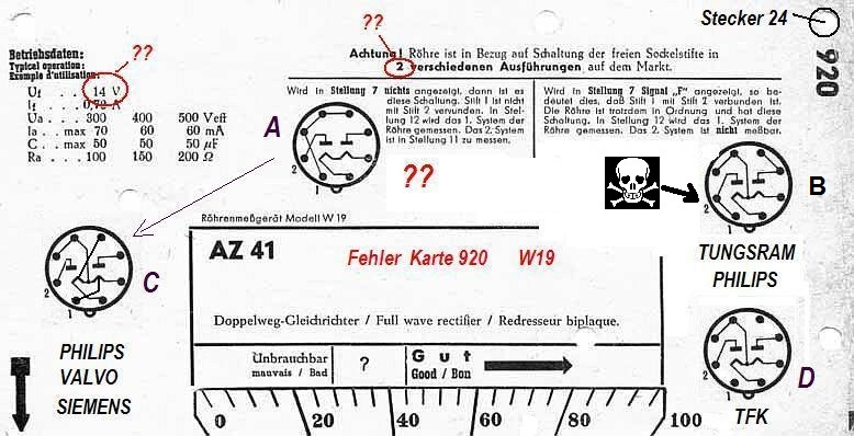 Aus unverständlichen Gründen hatte der Entwickler dieser Rimlockröhre eine abweichende Zuordnung der Heizfadenstifte gegeben. Normalerweise sind das die Stifte 1&8, bei der AZ41 jedoch 7&8! Alle Fassungen beim W19 haben eine feste Verdrahtung der Heizanschlüsse, so auch die Rimlockfassung auf Feder 1&8. Um dennoch die AZ41 testen zu können, wird über eine steckbare Brücke (Loch 24) eine interene Verbindung von Stift 1 nach 7 gemacht. Das ist eine Lösung für Ausführungen, wo wirklich Stift 1 vollkommen frei gehalten ist. Diese Bauform D findet man selten bei den ganz frühen TELEFUNKEN AZ41 mit Metallring unterhalb.