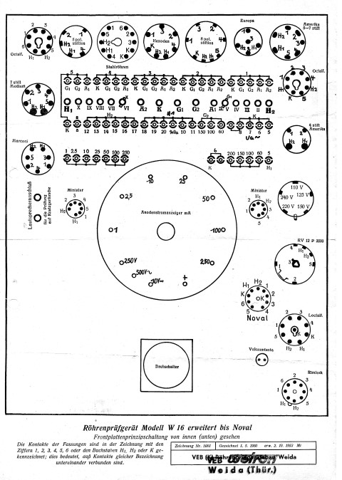 Um mich kurz zufassen, im Laufe der Jahre habe ich mich intensiv mit dem W16 beschäftigt und einige „Verbesserungen“ angebracht. Andere werden sagen, die Kiste wurde schwer „verbastelt“ ( oh je, der Wiederverkaufswert?). Wie dem auch sei, mit meinem RPG von 1938 kann ich praktisch die meisten Radio- oder TV-Röhren testen, selbst so komische Typen wie PD500, 6BN6 oder Nuvistoren. Klar, mit entsprechenden Zwischensockel und Emissionswerte, die von neuwertigen Röhren ermittelt wurden zur gut – noch brauchbar – unbrauchbar Beurteilung.