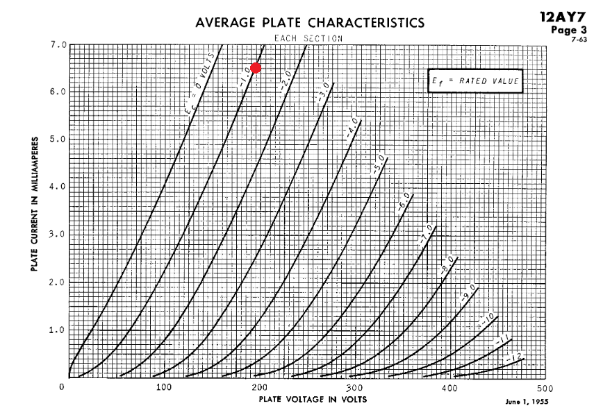 Schauen wir uns die Kennlinien der 12AY7 -bei der gleichen Einstellung- an, dann soll der Ia ~6,5 mA betragen!