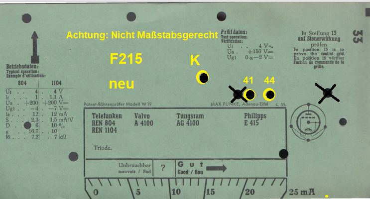 Der Unterschied liegt in der abweichenden Heizspannung. Man muss also für die F215 die Uf auf 2 Volt einstellen!! Habe das mal auf dem Computer geändert. Aber aufpassen, du musst sicher sein, dass die beiden Stöpsel jetzt in die neuen Löcher 41 & 44 kommen. Ebenso ist die Seitenschraube mit dem zusätzlichen Loch "K" zu verbinden. Solltest du keine Erfahrung mit solchen Änderungen haben: Lass' die Fingers davon, bitte....