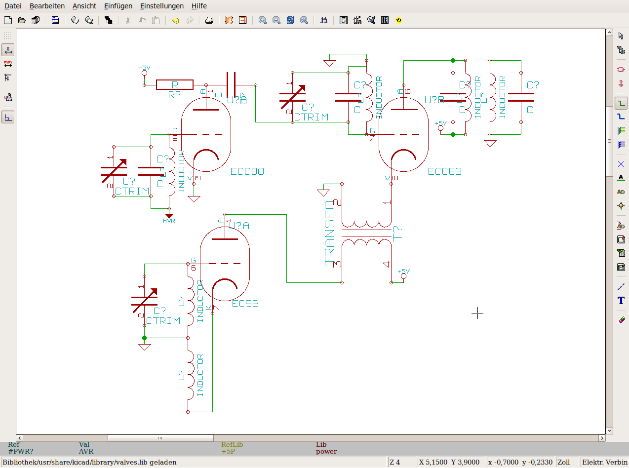 Mein voriger Beitrag war nicht als Kritik oder Besserwisserei gemeint. Es ging mir um das Aufzeigen des Schaltungsprinzip der additiven Mischung und der Probleme daraus. Deine Schaltungsidee hat es auch in sich. So wie ich das verstehe soll eine multiplikative Mischung erfolgen mit Katodeneinspeisung der F Osz. bei der EC(C)89. Die Oszillatorröhre ist mit EC92 bezeichnet soll eine EC86 sein nehme ich an. Die HF Vorstufe ist eine Triode der ECC89 in Katodenbasisschaltung, es könnte Probleme mit der C gitter - anode geben. Deshalb mein Hinweis auf eine mögliche Neutro Notwendigkeit. Die Übertragerkopplung finde ich schon gut, auf diese Weise hat man eine Entkopplung zwischen Gleich und Wechselstrompfad, könnte für die Arbeitspunkteinstellung nützlich sein. PS: Eine Einspeisung über R Spannungsteiler könnte auch gehen über Trenn C zur Katode ECC89 und mit HF Drossel zwischen Katode und R Katode.