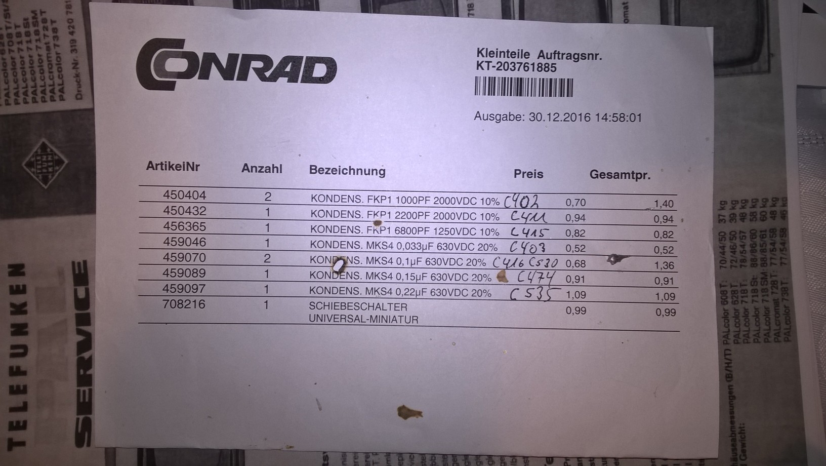 Diesen Luxus gab es bis Mitte der neunziger Jahre. Ich beziehe mich dabei auf Fernsehgeräte. Schüttgut, wie Radiorecorder, Radiowecker und Ähnliches wurde nicht mehr repariert, sondern nur getauscht. Ich beziehe mich auf die Firmen Telefunken, Nord-Mende und Grundig. Schlimm wurde es mit dem Erscheinen der Dönerkisten. Ich wünsche Dir einen guten Start in das Jahr 2017.
