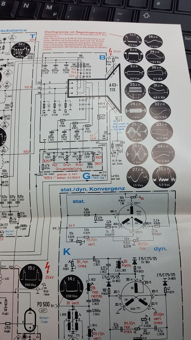 Nach dem Austausch der Kondensatoren in der Horizontalstufe ist das Bild jetzt nicht mehr geteilt und es steigt auch kein Wölkchen mehr auf von einem Widerstand. Ein Foto mit den Austauschkondensatoren und den Bezeichnungen im Schaltplan anbei. Jetzt fehlt nur noch die Farbe, das Bild ist weiterhin s/w. Ein Kondensator zwischen den PCL200 fehlt, die Nummer ist C623. Hat jemand die Werte davon?