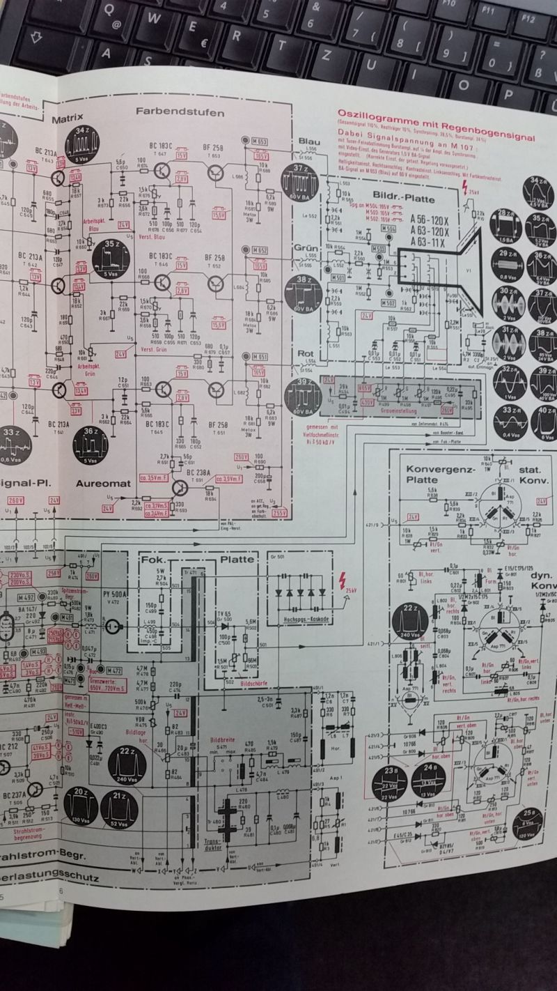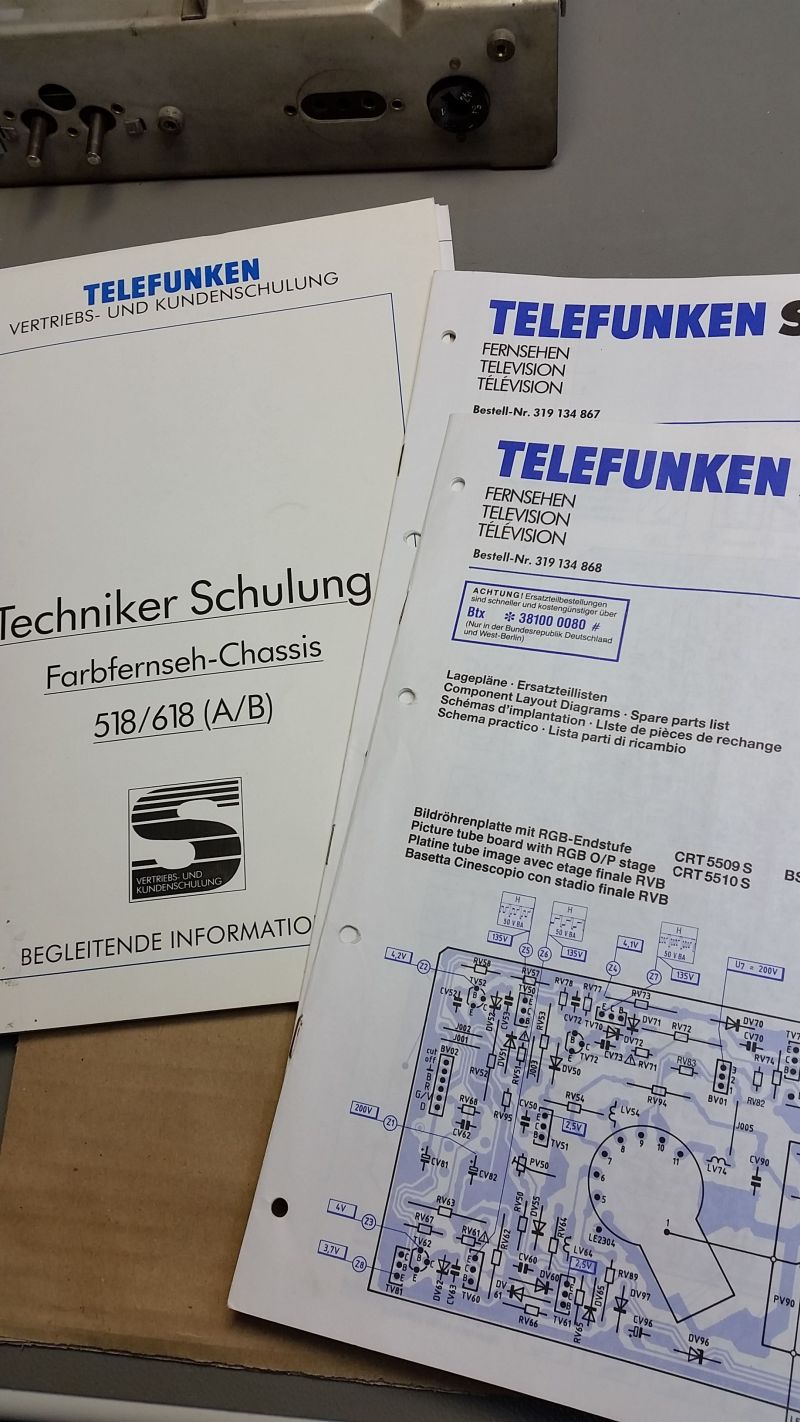 Meine Unterlagen sind original von 1968. Zweifarbiger Druck mit grau schattierten Baugruppenzusammenfassungen, allen notwendigen Spannungen und Oszillogrammen und einem Fehlersuchbaum (!!!) Auch eine 26-seitige Schaltungsbeschreibung ist dabei. Was für ein Luxus für die Radioler von damals