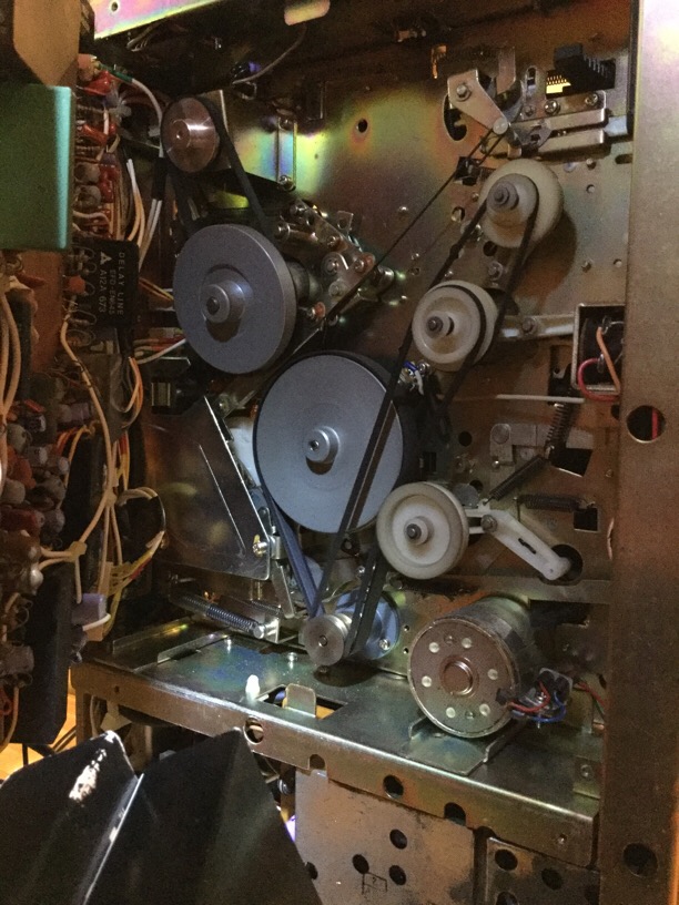 Trotzdem bleibt die Mechanik immer wieder beim Druck auf "Play" hängen, d.h. das Band wird zwar um den Videokopf gelegt aber das Band wird erst abgespielt, wenn ich dem Antriebsrad etwas (in Pfeilrichtung) nachgeholfen habe und ein mechanisches Einrasten zu hören war. Die Antriebsriemen wirken bei diesem Modell wirklich äußerst robust. Ich lege ein paar Fotos bei, damit ihr Euch selbst ein Bild machen könnt.