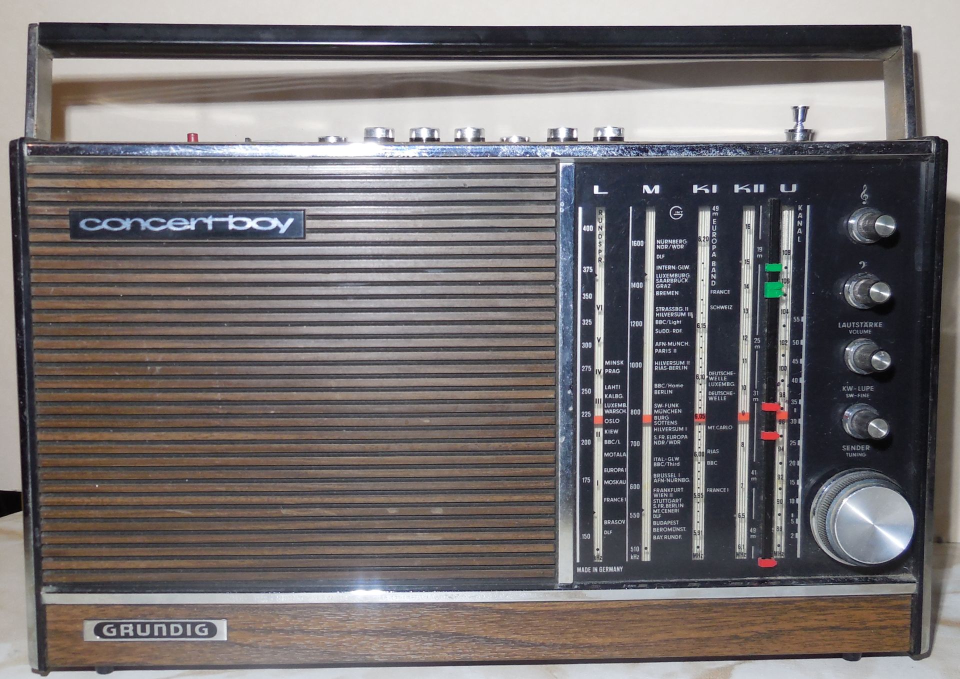 ich hätte da einen Grundig Concertboy. Das Gerät hat aber nur 2KW-Bereiche, sowie KW-Telelupe. Wenn Interesse an einem Photo besteht, werde ich ihn mal äusserlich aufpolieren (so gut es geht) müssen. Hier ist schon mal ein Photo von meinem Grundig. Übrigens, er hat eine sehr gute Trennschärfe auf UKW. Ich empfange damit hier den SRG, obwohl direkt daneben ein starker Münchner Sender ist.