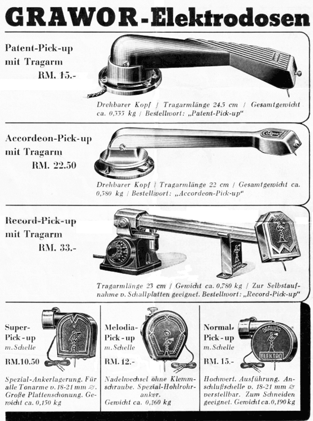 Ab den 30er Jahren ließen sich entweder komplette Systeme, aber auch Tonabnehmer zum aufstecken für ältere Grammophone kaufen.