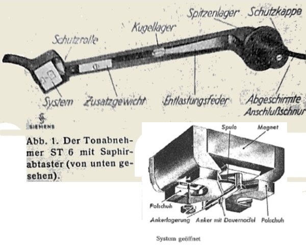 Der erste, wirklich moderne Leittonabnehmer mit Saphirnadel (Dauernadel) und einem nahezu linearen Frequenzgang von ~ 40Hz - 10.000Hz war der 1937 von Telefunken vorgestellte TO 1000. Der Nachfolger TO 1001 (Baugleich zu Siemens ST 6) wurde von verschiedenen Firmen bis in die frühen 50er Jahre nachgebaut (z.B. RFT). Auflagegewicht ~ 25gr. Viele der anderen, frühen Tonabnehmer brachten immer noch gut 120gr - 200gr auf die Nadelspitze.