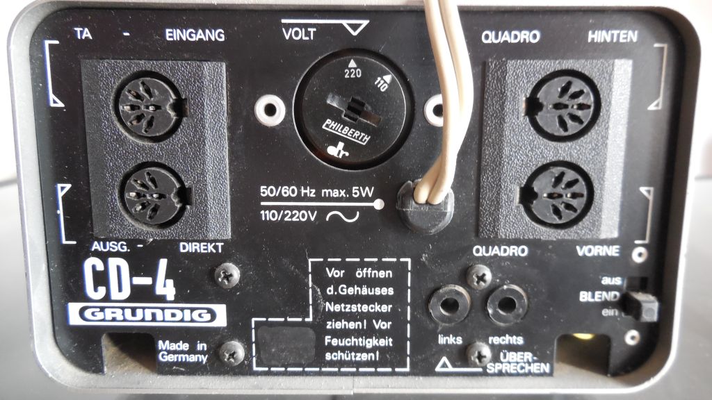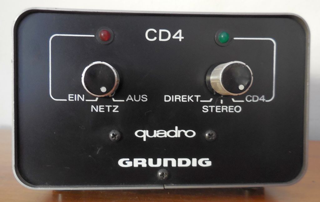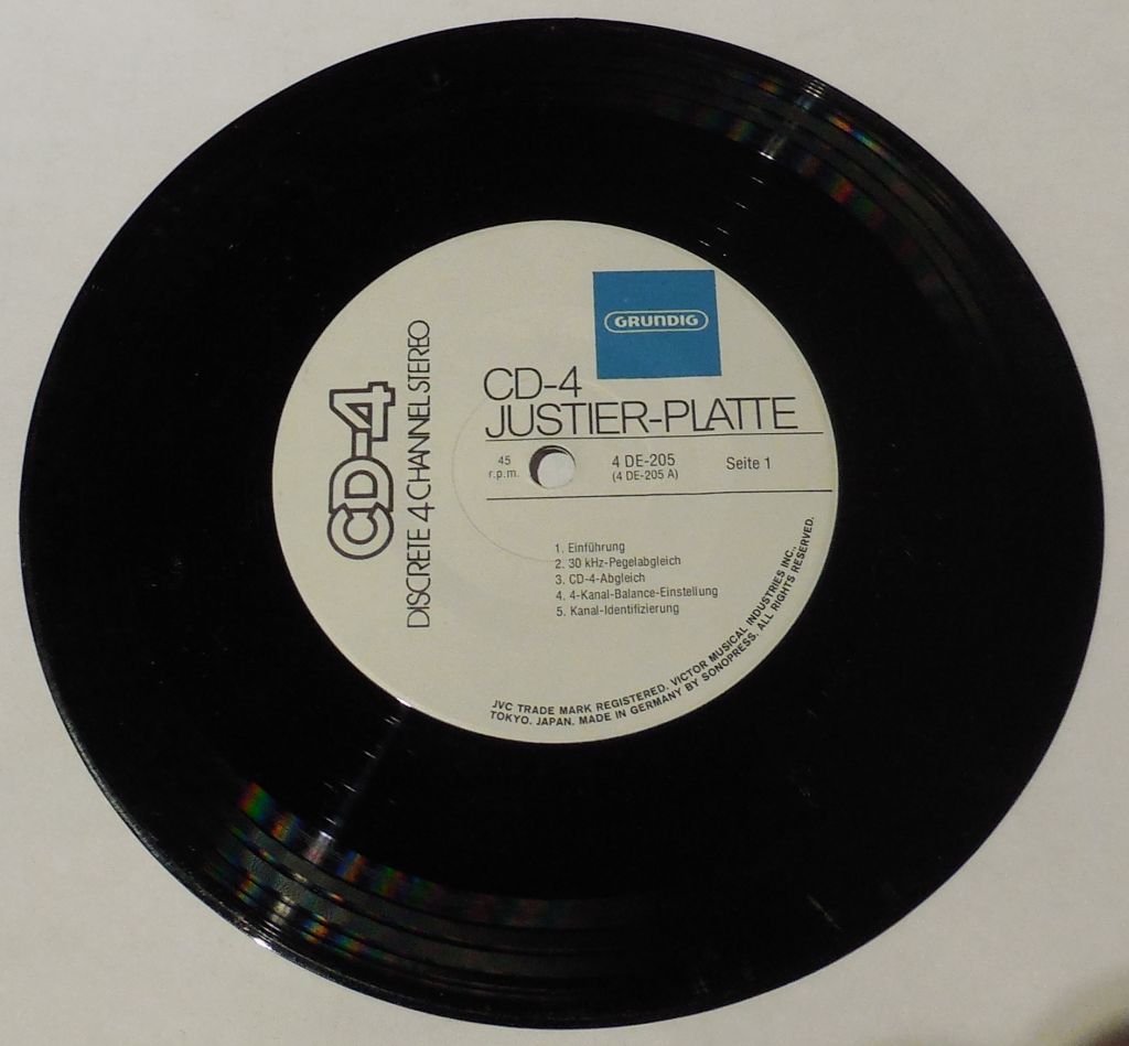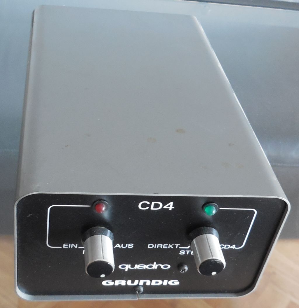 Eine andere Version waren die Quatro-Platten, bei denen man mittels eines Pilottones (ähnlich wie bei Rundfunk-Stereo) vier Kanäle 'erzeugen' konnte. Um ein störungsfreies Pilotton-Signal zu bekommen, musste man Plattenspieler mit Riemenantrieb und Magnet-Systemen verwenden. Mit guten Kristall-Tonabnehmern ging es auch, aber die Aussetzer nervten. Ausserdem war hier noch ein Quatro-Adapter notwendig. Zur Einstellung gab es eine Testplatte. Wenn man die einzelnen Kanäle gut separiert eingestellt hatte, konnte man am Ende der Platte ein kreisend, aufsteigendes Flugzeug hören. Nächste Woche, nach meinem Urlaub, schicke ich mal ein Bild von meinem Grundig Quatroadapter.