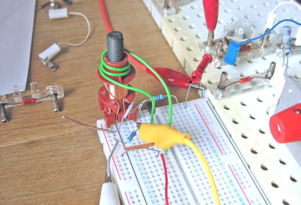 Das die Schaltung mit einem einzigen Kreis 5 kHz an der Schwinggrenze aufzulösen vermag, ist für Lern- und Experimentierzwecke doch recht gut. Mit meiner Spule und Feritkern kann auch die induktive Abstimmung sehr schön gezeigt werden. Mit Sekundenkleber habe ich einem passenden Kern ein Abstimmrad verpasst. Das funktioniert wunderbar. Als Grundkörper für den FET und für die Spule habe ich vorhandene Teile aus einem rudimentären Polytronik 5 benutzen können. Die Spule wurde mit 1mm Bohrungen eingepasst und zuvor verlötet. Das ist stabil und robust.