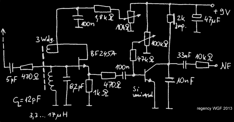 Ich habe mir dann überlegt, dass es Sinn machen würde, den Kasten mit einem n-kanal Sperrschicht FET (BF245A) zu ergänzen. Mit diesem lässt sich die Audionstufe betreiben, ohne den Schwingkreis zu dämpfen. Sehr ähnlich einer Röhre. Als Sourcefolger mit Spannungsverstärkung = 1 kann man sich die Spulenanzapfung sparen.