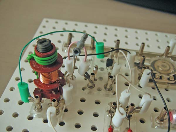 Hier schon mal ein schneller Aufbau eines Audion mit einem Si-Transistor. Die Spulen mit Ferritkern lassen sich übereinander stecken und so Schwingkreis und Ankopplung variieren. Anstelle der 6V habe ich 9V zur Spannnungsversorgung. Mit Drahtantenne 10 Meter und Nulleiter als Erde plärrt das schon sehr laut auf zwei Sendern MW, Stimme Russlands und DRadio.