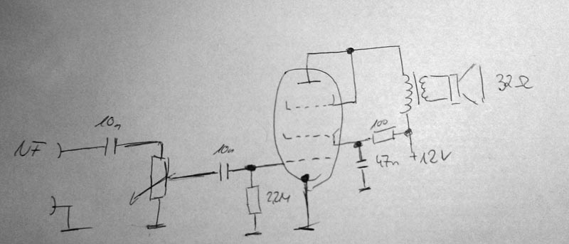 wir haben jetzt versucht die NF-Stufe von Transistor auf Röhre umzustellen. Wir benutzen eine zweite EF98, die Schaltung sieht skizziert ungefähr so aus.