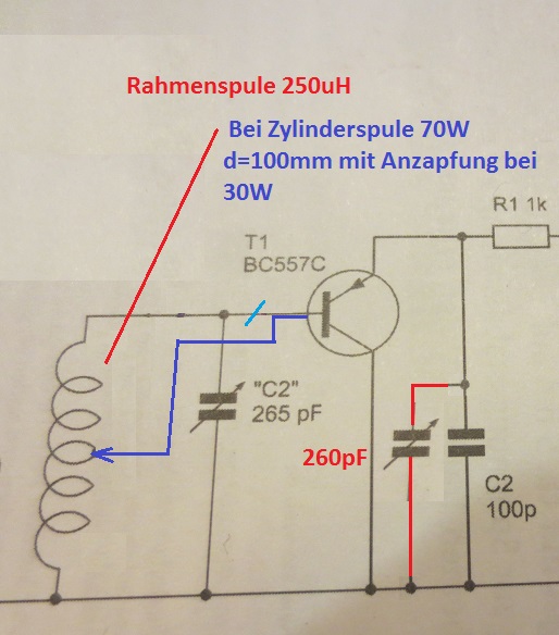 Bei der kapazitätsarmen Rahmenspule ist dann keine Anzapfung nötig. Mit Zylinderspule eine mittlere Anzapfung wählen. Der Franzisdrehko ist zu klein. Der müsste eher 500pF haben.