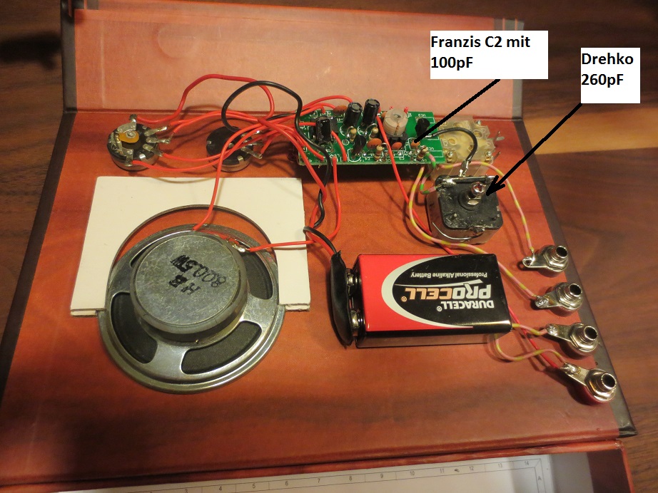 Mit Original sind franzis-Bauteile gemeint. Gemessen am Drehko ohne Trimmer, da ich die ja abmachen sollte. Habe bei der Ferritspule die einzelnen Litzen der beiden anderen Anschlüsse auch nochmal neu verlötet - Empfangssteigerung