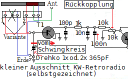 Nochmal zur Antenne: wird einige Meter Draht direkt angeschlossen, so kann dessen Kapazität das untere Frequenzende um z.B. 80 kHz weiter nach unten verschieben und das obere sogar um 500 kHz. Wenn du den Antennendraht über einen kleinen Festkondensator 10 bis 20 pF ankoppelst, sollte sich der Empfangsbereich nach höheren Frequenzen verschieben, Rückkopplung und Trennschärfe verbessern. Die Lautstärke geht dann etwas zurück.