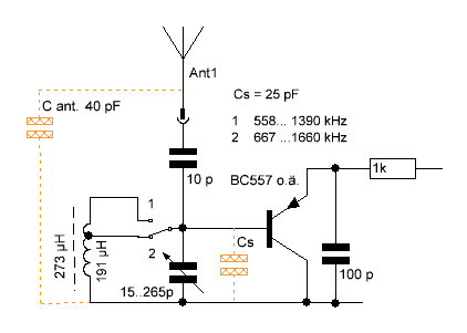 Die Zeichnung zeigt eine mögliche Lösung: Der Mittelwellenbereich wird mit einem Schalter zum Spulenabgriff aufgeteilt. Es wäre interessant zu erfahren, was diese Variante bei dem Retroradio bewirkt. Bitte schwache Antennenkopplung, ggf. gar keine verwenden. Die Werte von Cs und Cant sind Annahmen von mir.
